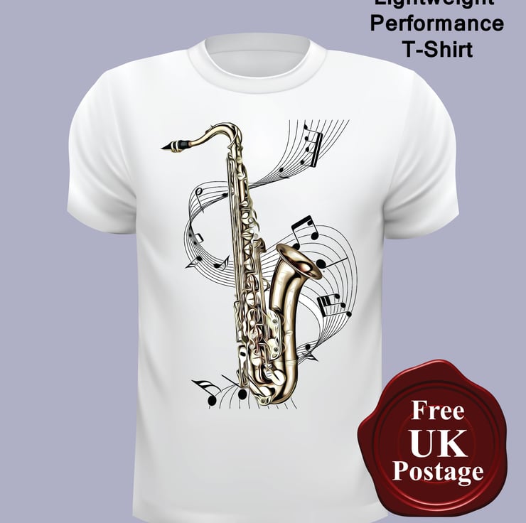 Saxophone T Shirt, Choose Your Size, designed by us Aggies Bags the 169 gsm 100% Polyester cotton feel Ringspun T Shirt is seamed with a single needle 1.9cm collar. Taped neck. Twin needle sleeve and bottom hems. Quarter-turned to eliminate centre crease. Oeko-Tex Standard 100 certified,