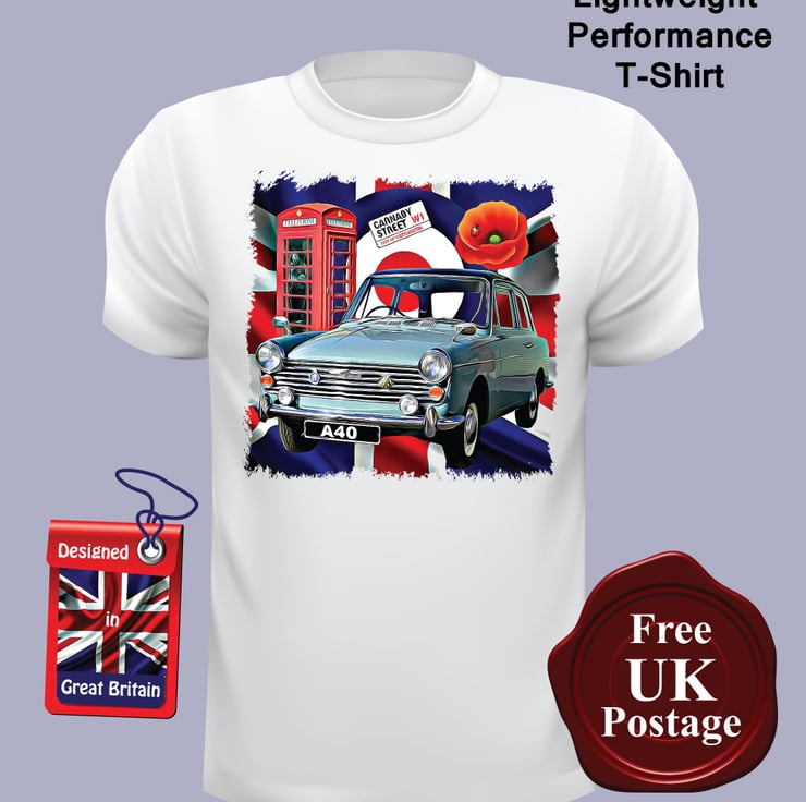 Austin A40 Farina T Shirt, Choose Your Size, designed by us Aggies Bags the 169 gsm 100% Polyester cotton feel Ringspun T Shirt is seamed with a single needle 1.9cm collar. Taped neck. Twin needle sleeve and bottom hems. Quarter-turned to eliminate centre crease. Oeko-Tex Standard 100 certified,