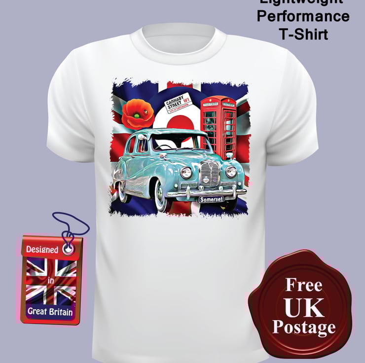 Austin A40 Somerset T Shirt, Choose Your Size, designed by us Aggies Bags the 169 gsm 100% Polyester cotton feel Ringspun T Shirt is seamed with a single needle 1.9cm collar. Taped neck. Twin needle sleeve and bottom hems. Quarter-turned to eliminate centre crease. Oeko-Tex Standard 100 certified,