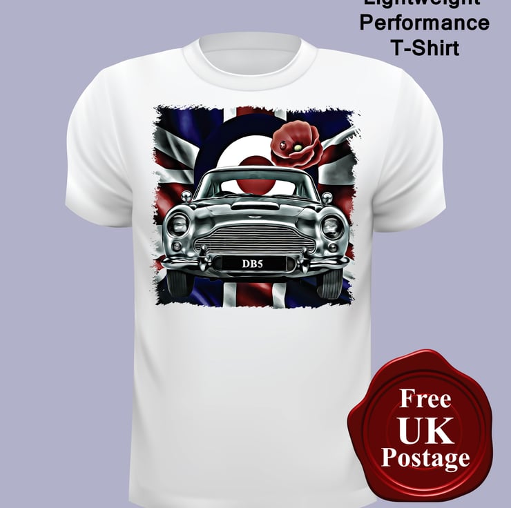 Aston Martin DB5 T Shirt, Choose Your Size, designed by us Aggies Bags the 169 gsm 100% Polyester cotton feel Ringspun T Shirt is seamed with a single needle 1.9cm collar. Taped neck. Twin needle sleeve and bottom hems. Quarter-turned to eliminate centre crease. Oeko-Tex Standard 100 certified,