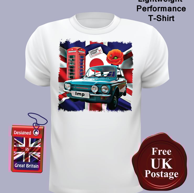 Hillman Imp T Shirt, Choose Your Size, designed by us Aggies Bags the 169 gsm 100% Polyester cotton feel Ringspun T Shirt is seamed with a single needle 1.9cm collar. Taped neck. Twin needle sleeve and bottom hems. Quarter-turned to eliminate centre crease. Oeko-Tex Standard 100 certified,