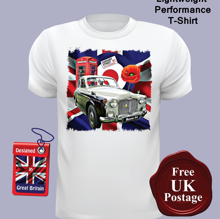 Rover P4 T Shirt, Choose Your Size, designed by us Aggies Bags the 169 gsm 100% Polyester cotton feel Ringspun T Shirt is seamed with a single needle 1.9cm collar. Taped neck. Twin needle sleeve and bottom hems. Quarter-turned to eliminate centre crease. Oeko-Tex Standard 100 certified,