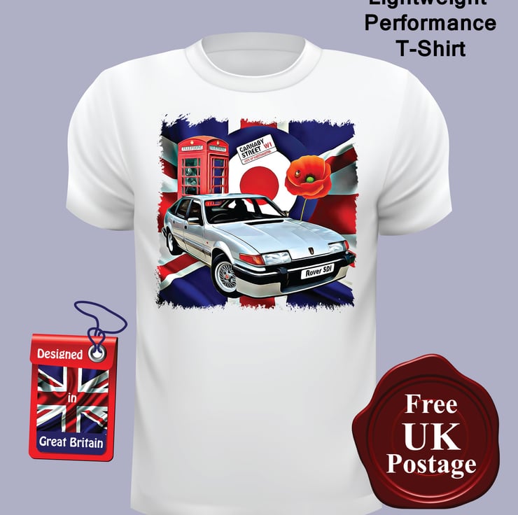 Rover SD1 T Shirt, Choose Your Size, designed by us Aggies Bags the 169 gsm 100% Polyester cotton feel Ringspun T Shirt is seamed with a single needle 1.9cm collar. Taped neck. Twin needle sleeve and bottom hems. Quarter-turned to eliminate centre crease. Oeko-Tex Standard 100 certified,