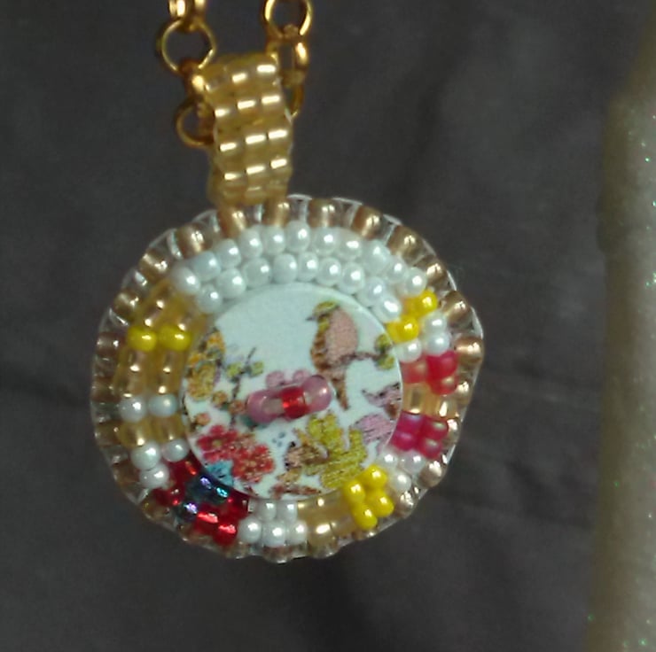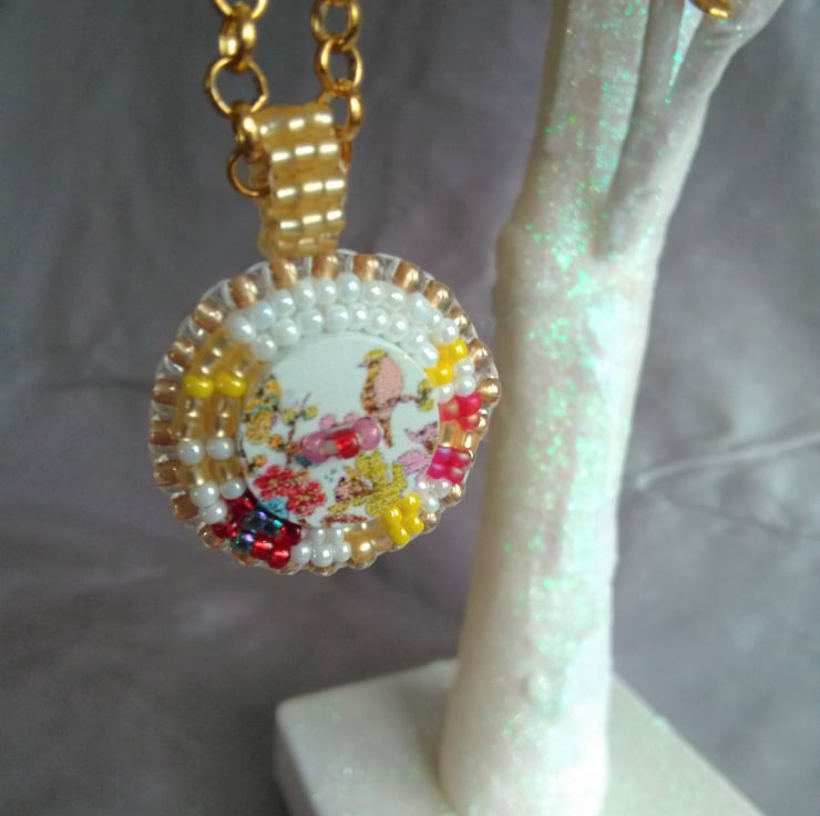 I love this little japanese bird and wanted to do him justice by using bright and beautiful colours for the surrounding bead embroidery. I decided to finish it with a gold-plated chain as it complements the gold coloured beads and gives the finished piece a nice weight.
