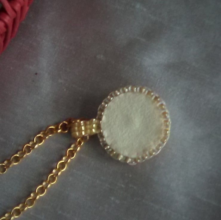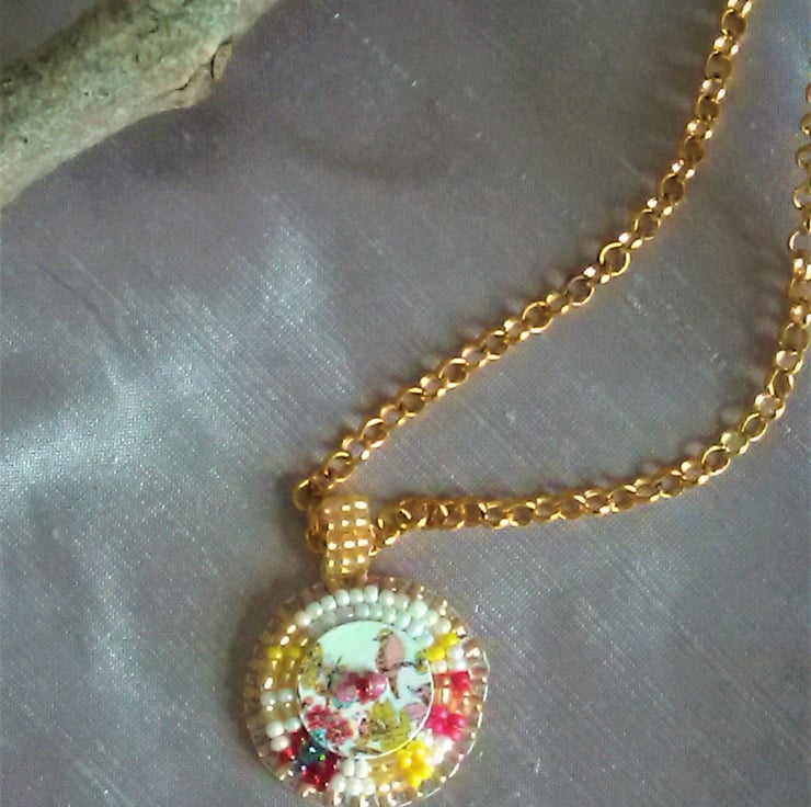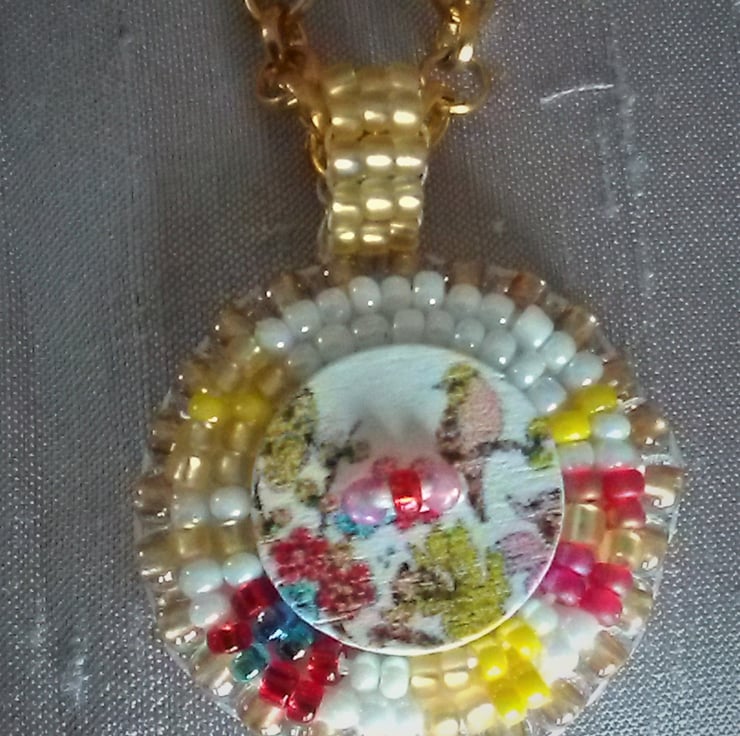 A very pretty scene of a Japanese bird perched amongst blossom. This pendant is composed of a central painted wooden button, which is enhanced by bead embroidery in toning colours. Miyuki seed beads in shades of red, blue, gold and yellow are included in the design. There is a brick stitch border to this piece and it is backed with cream Ultrasuede. It hangs from a simple gold plated chain with a matching lobster clasp.