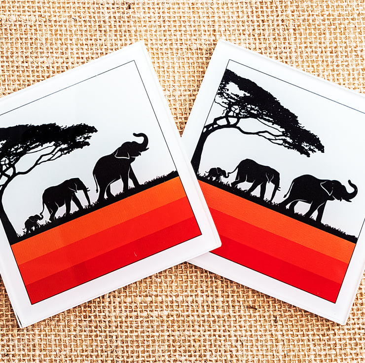 This lovely glass coaster shows a family of elephants on patrol in the African grasslands complete with baobab tree. A modern, graphic design that is bound to please any elephant or animals lover. It goes particularly well with my orange elephant mugs - please see my other listings.