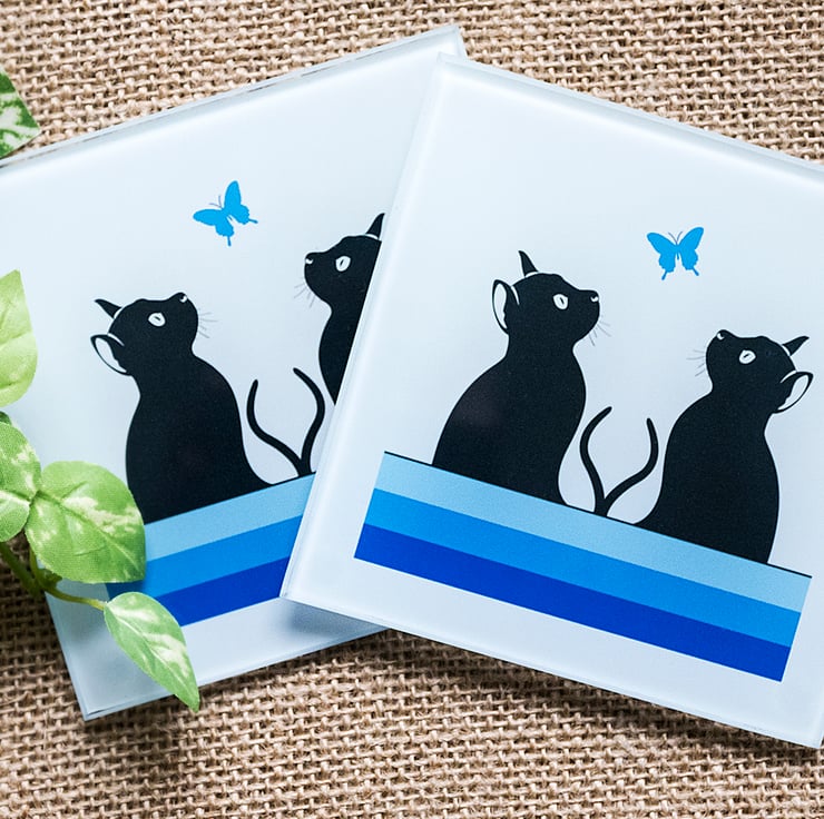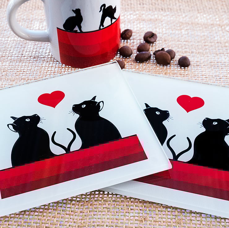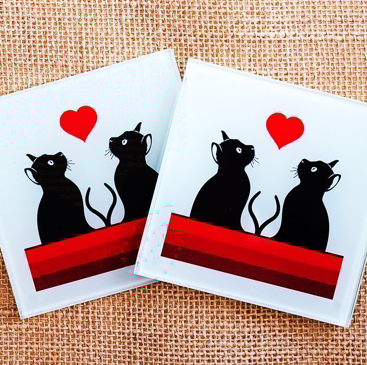 This lovely glass coaster shows a couple of graphic cat silhouettes looking up at a red heart. It goes particularly well with my red cat mugs - please see my other listings - and would make the prefect gift for any cat lover!
