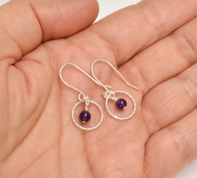 Amethyst and Sterling Silver Sparkly Slim Circle Earrings