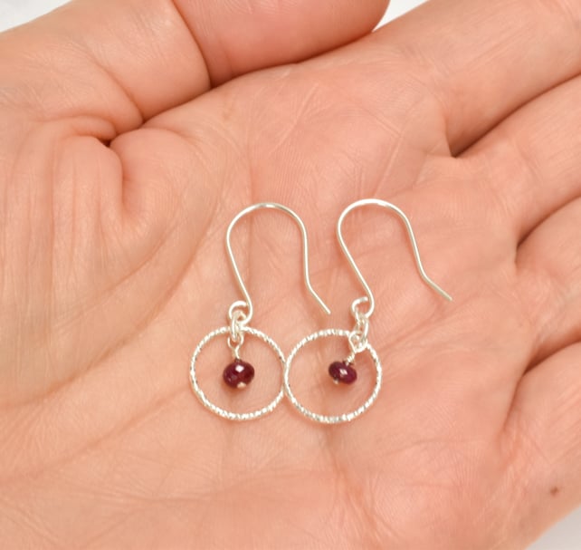 The Sterling Silver circles are approx 12mm in diameter, and the Rubies are 2-4mm nuggets from Longido, in Ethiopia.