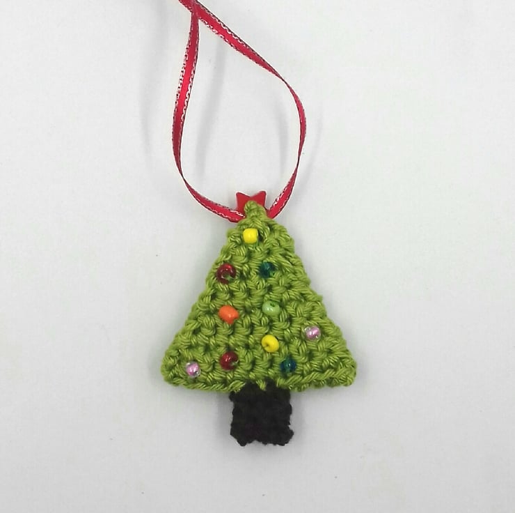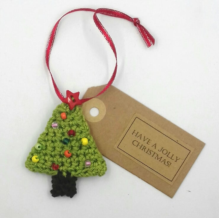 A festive tag this year and a pretty tree decoration for many a year to come! The tree is crocheted in cotton and lined with felt. It is decorated on both sides with tiny glass beads and there is an star shaped button on top of the front. The decoration hangs from a red and silver ribbon which is threaded through the tag.