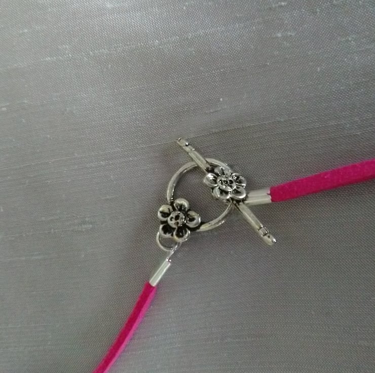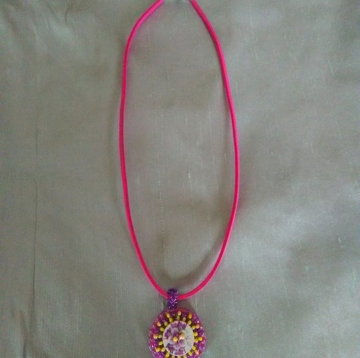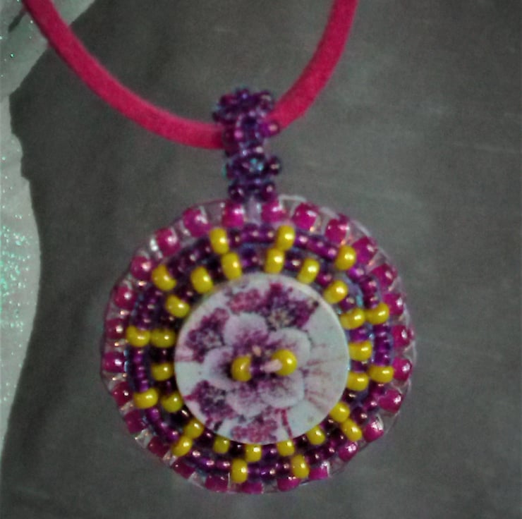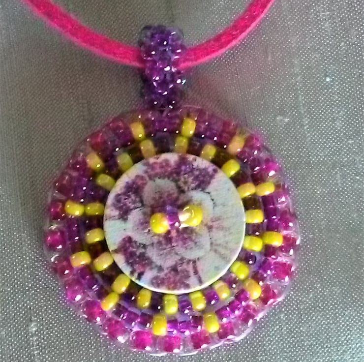 A bead embroidered pendant in zingy colours of magenta and bright yellow. The focal painted wooden button is brought to life with gorgeous miyuki seed beads. It's backed with fuchsia Ultrasuede and hangs from a length of fuchsia microfibre suede cord. Fastens with a very pretty Tibetan silver flower toggle clasp.