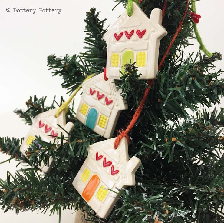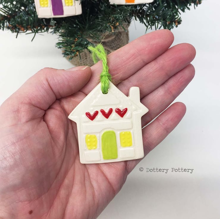 This little pottery house decoration is made from white earthenware clay and decorated in bright, bold colours. It has been fired twice and finished with a glossy glaze for a lovely smooth finish. It measures 5 x 5cm and hangs from a matching brightly coloured string.