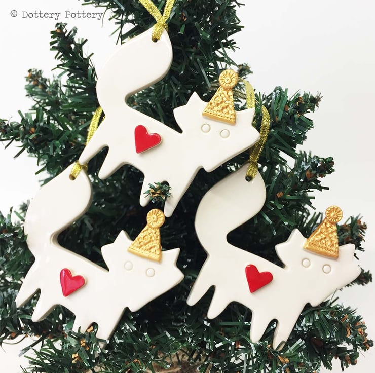 This is for ONE decoration only. These cute little foxes are made from white earthenware clay and finished with a golden party hat. They are then fired and glazed, then fired again. It hangs on a gold string - ready to hang on your tree. Each decoration measures 8x8cm and is glazed in the front only. The photograph makes it look bright white but the decoration is actually cream.