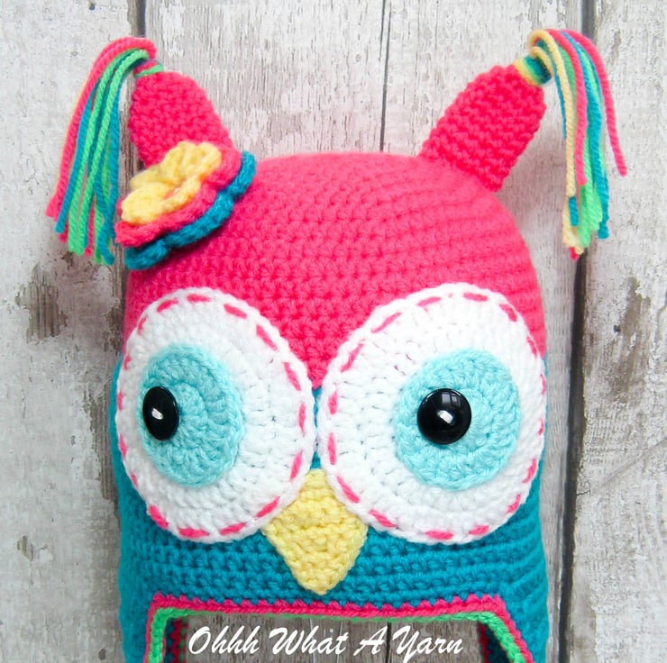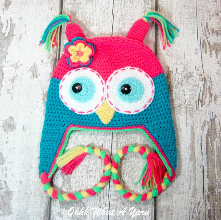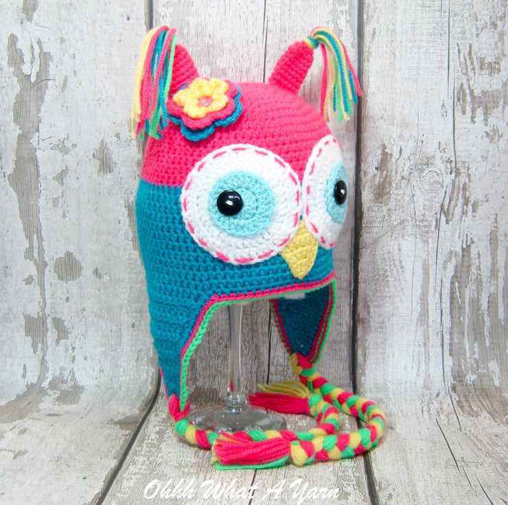 This cute little owl hat is crocheted in 100% acrylic yarns in gorgeous bright shades.