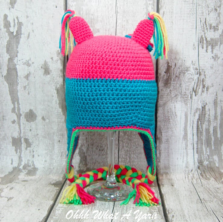 She has crochet ear flaps and plaited ties with tassels, ears with tassels and a pretty crochet flower on her head.