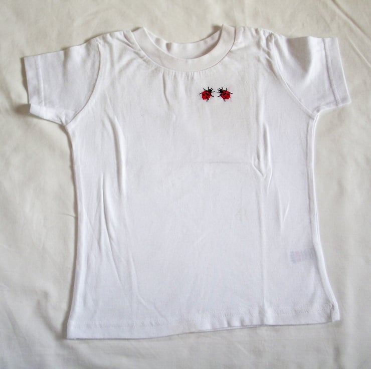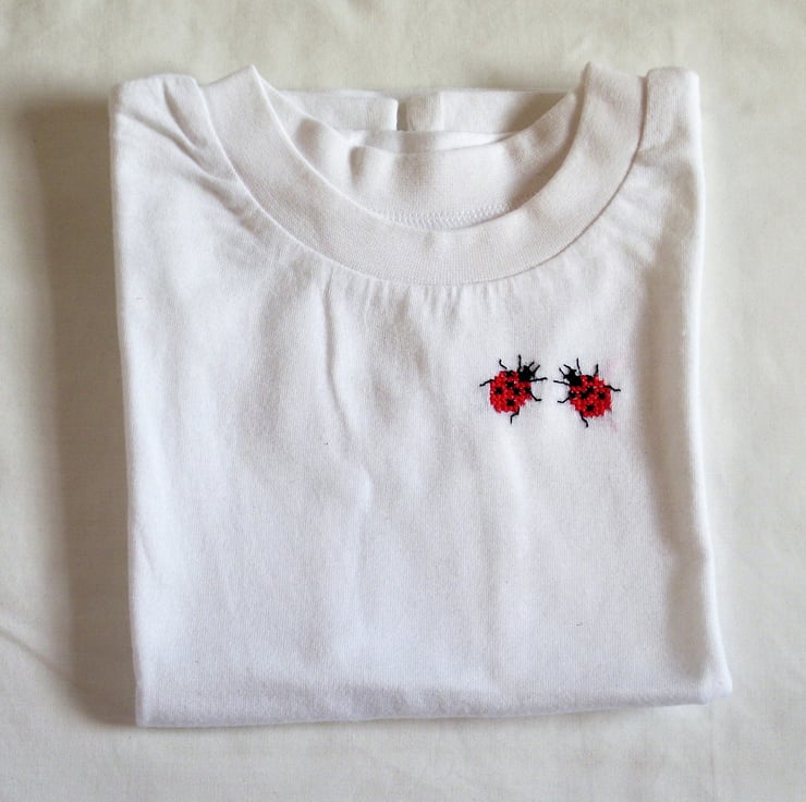 Almost all kids love ladybirds. This is a lovely white T-shirt on which I have hand embroidered two ladybirds facing one another, as though in deep conversation. It is 100% cotton, and is machine washable.