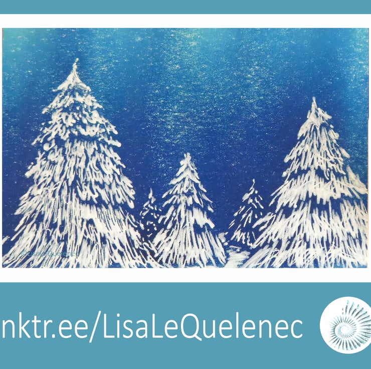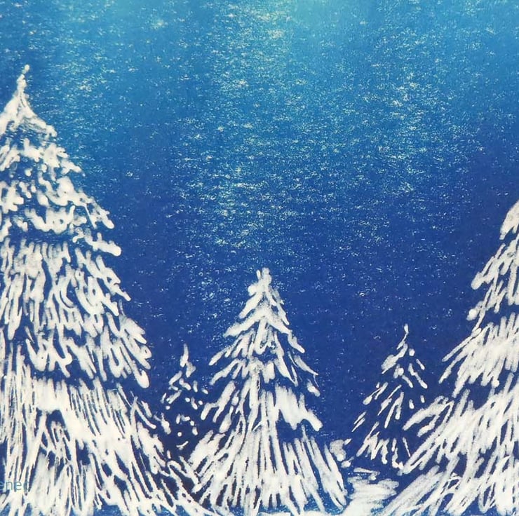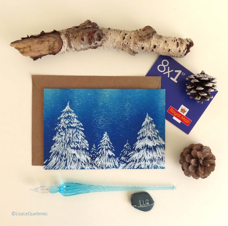 A blank greeting card reproduced from my original mixed media art of trees in the snow at night.