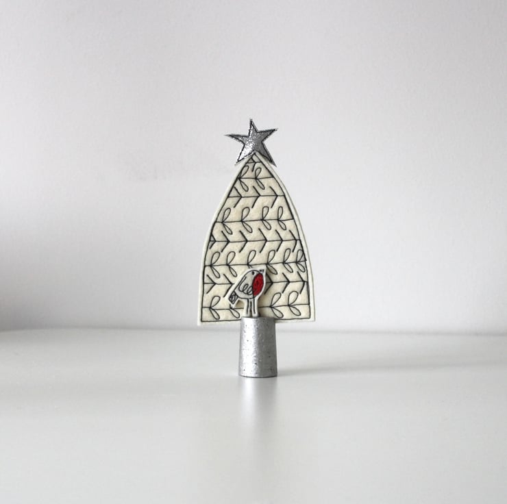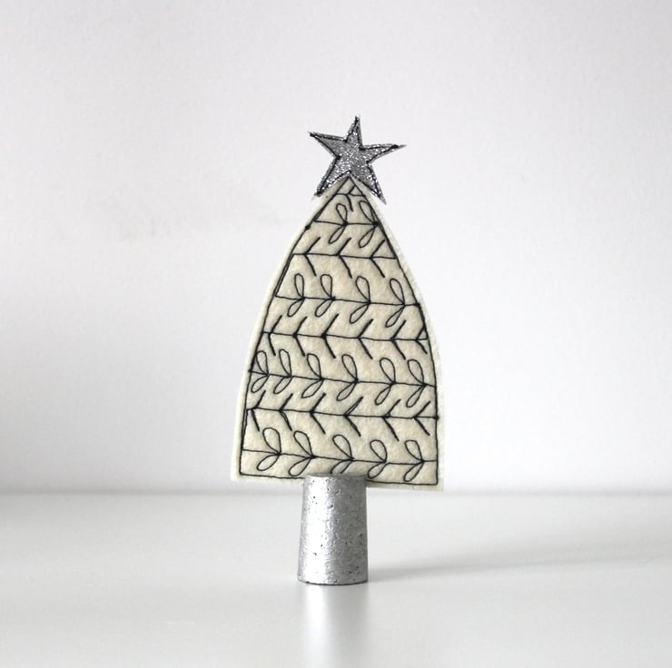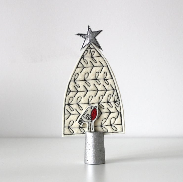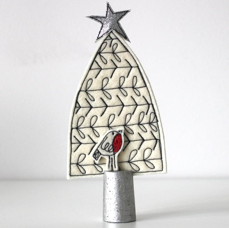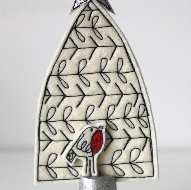 Little trees are created using free hand machine embroidery, 100% wool felt, glitter cloth and painted cork trunks.