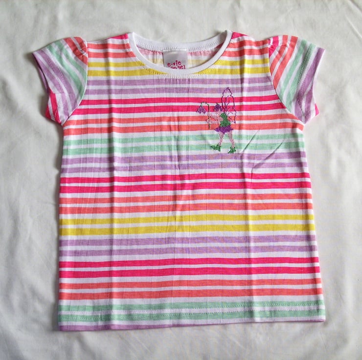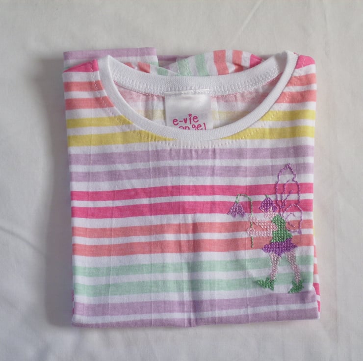This is a prettily striped T-shirt with slightly puff sleeves. I have hand embroidered a fairy on it in shades to complement the colours of the stripes, namely lemon yellow, mauve, dark pink, peach and light green, all on white. The fairy has variegated mauve wings and wears mauve and green. He carries a bell-shaped mauve flower. The shirt is 100% cotton and can be machine washed.