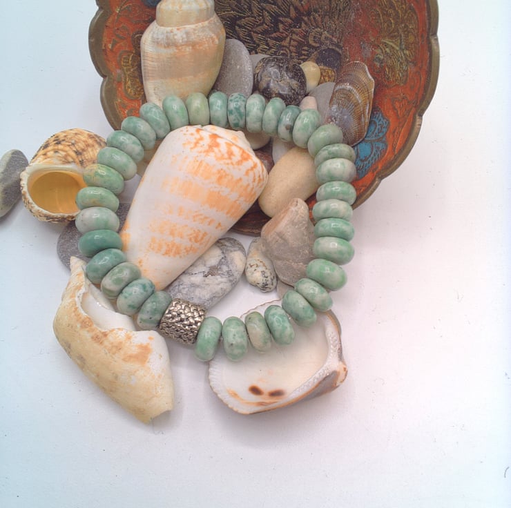 This fun beaded bracelet is an ideal birthday gift, Christmas gift or gift for Fathers Day for any of the men in your life. The bracelet is made using 10 mm x 6 mm green disc howlite beads with a silver plated lattice tube spacer bead. The beads are threaded onto jewellers elastic to make it stretchy. It is 18.5 cm long in its unstretched state. The bracelet will be dispatched wrapped in tissue paper in an organza bag and delivered to you via Royal Mail first class post.