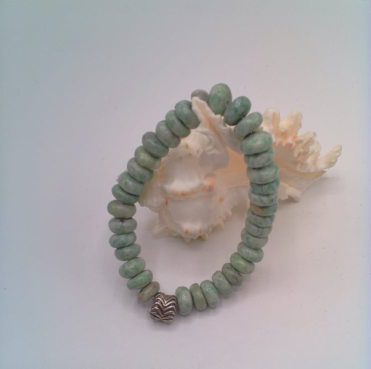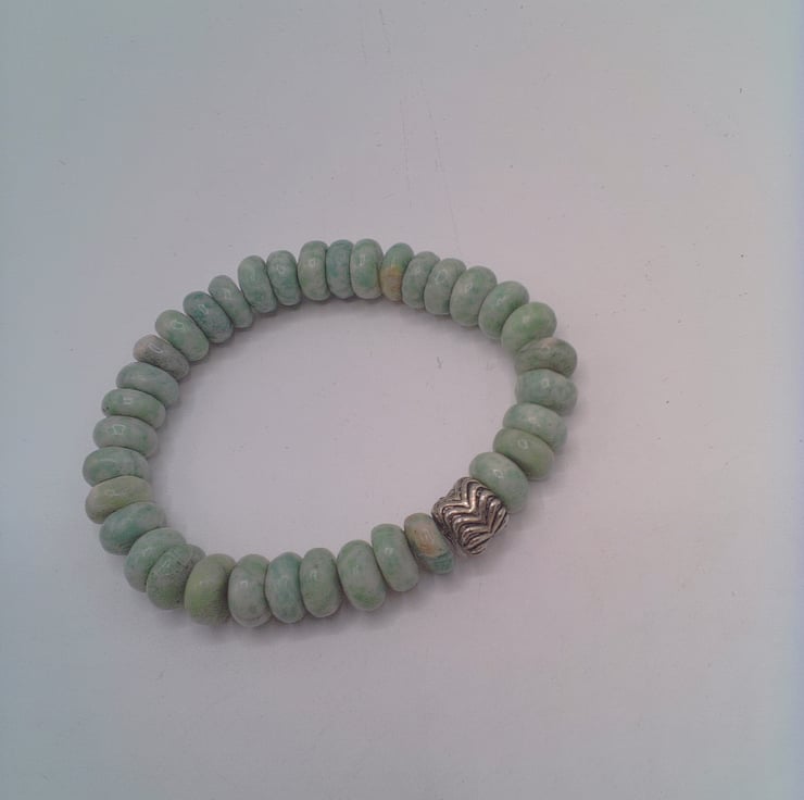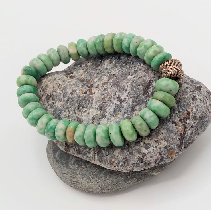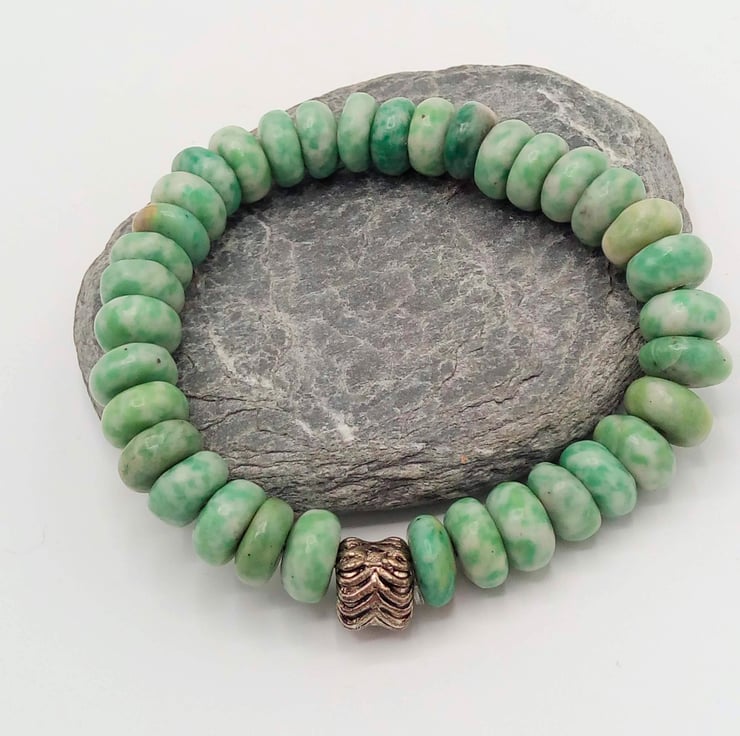 This fun beaded bracelet is an ideal birthday gift, Christmas gift or gift for Fathers Day for any of the men in your life. The bracelet is made using 10 mm x 6 mm green howlite disc beads and a silver plated drum spacer bead. The beads are threaded onto jewellers elastic to make it stretchy. It is 18.5 cm long in its unstretched state. The bracelet will be dispatched wrapped in tissue paper in an organza bag and delivered to you via Royal Mail first class post.