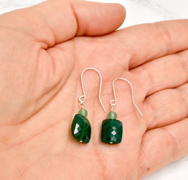 When I have these gorgeous AA Green Onyx rectangles on my craft fair stall, everyone makes a bee line for them - the colour and depth of the gemstones is simple fabulous. They've been faceted by the wonderful gemstone cutters in Jaipur, India (known as the gemstone cutting capital of the world) so as well as being the greenest of greens they catch the light in a sparkly but non-bling-y way. On top is a toning lighter green Aventurine round, and everything else is made from Sterling Silver.