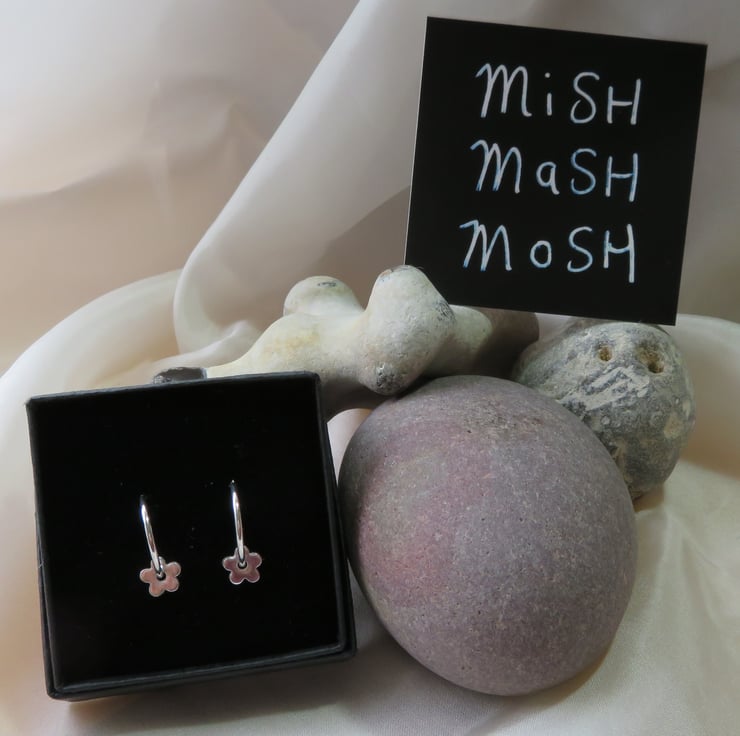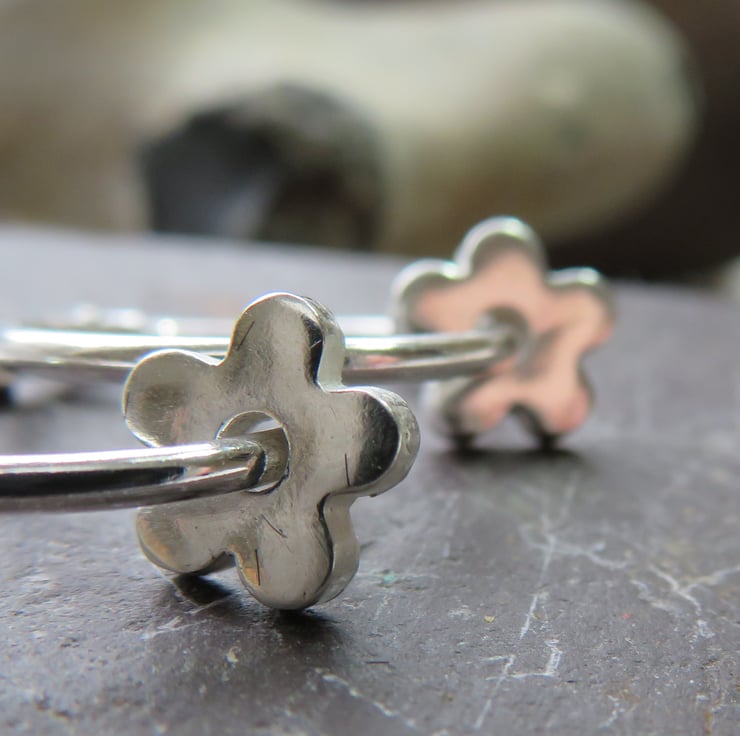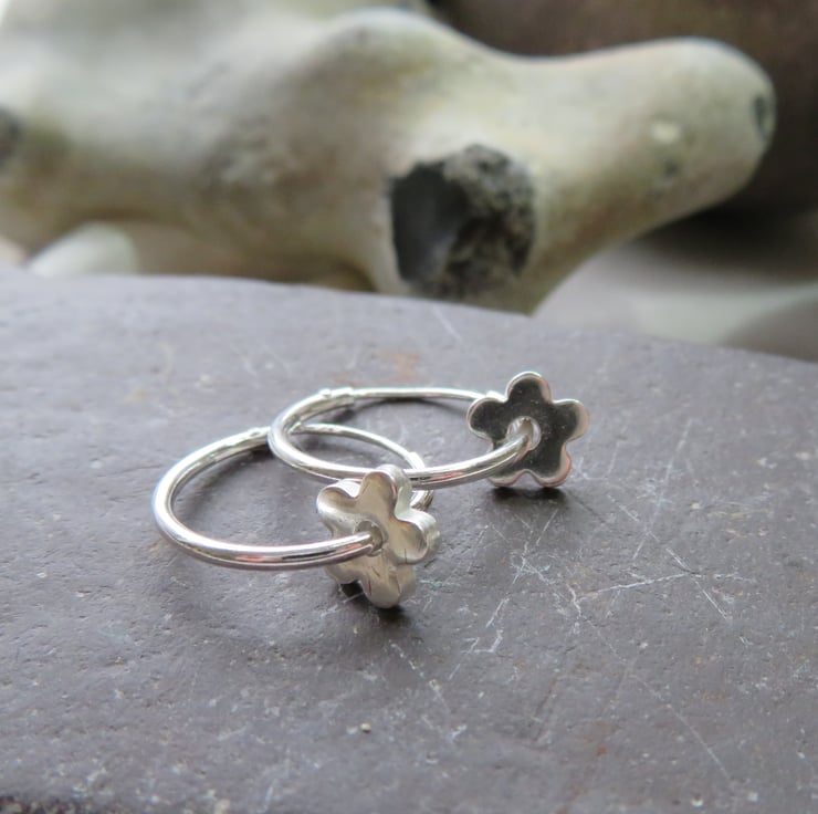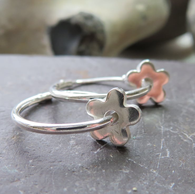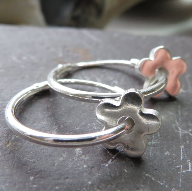 Tiny 8mm fine silver flowers hung on 15mm sterling silver creole hoops.