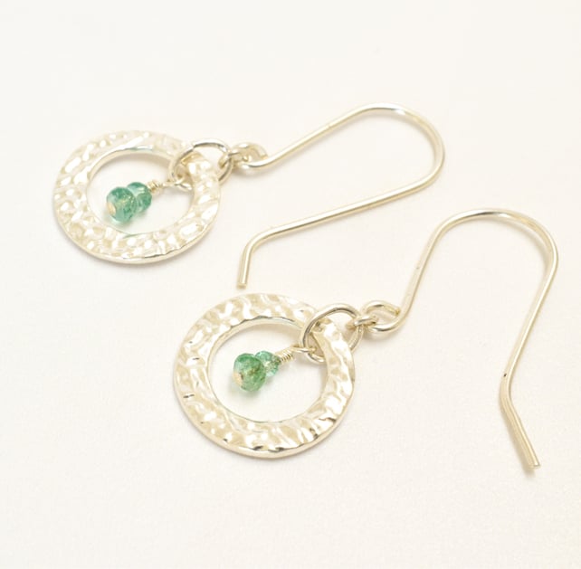 Sparkly, green Emeralds are surrounded by textured fine silver circles in these lovely earrings. Although little bit larger and more solid than my slim circle earring design, these are still delicate and discreet earrings. The Emeralds are small, but they sparkle and catch the light.