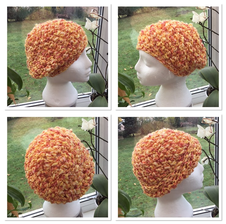 I thoroughly enjoy creating useful and unusual items with yarn. This lovely tropical toned hat will go with so many outfits, perfect for the autumn & winter seasons & for any one who loves unique & bespoke items and marches a crocheted infinity scarf listed separately. If the two items are bought together, then £2.00 will be refund from the combined purchase price.