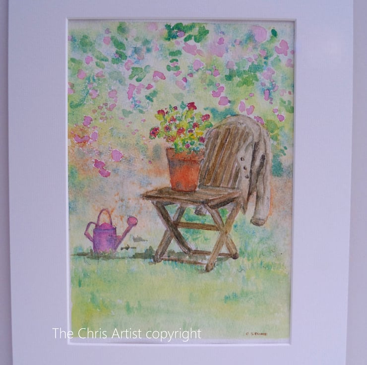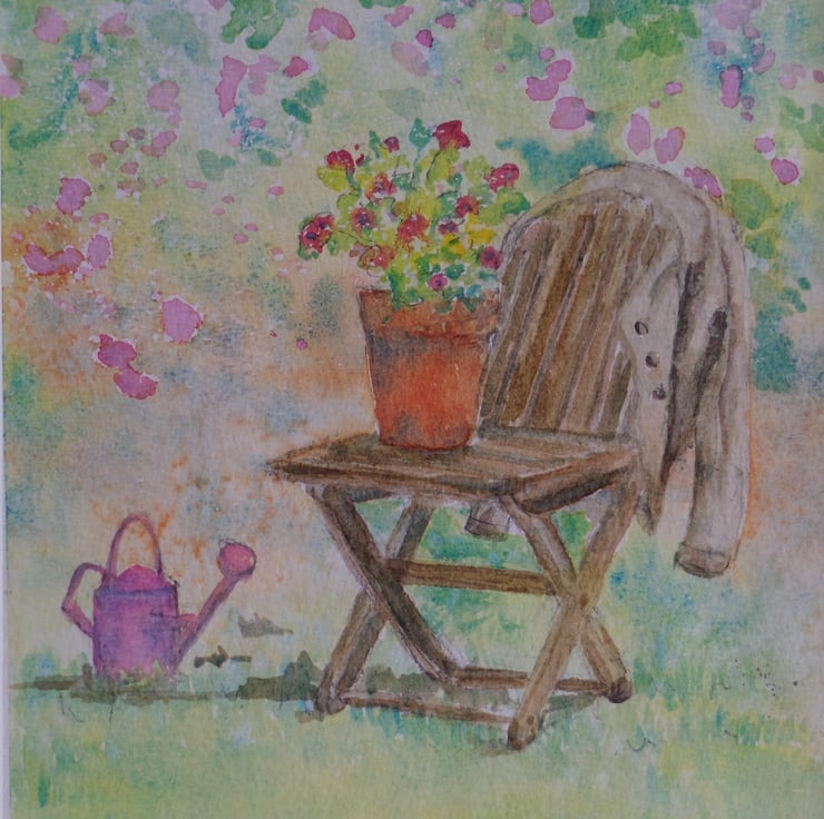My original watercolour painting of a still life garden scene of a wooden chair against a backdrop of pink blossom.