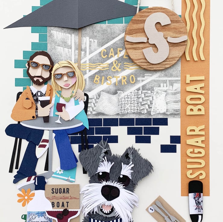 This enterprising local wine bar & bistro lends itself beautifully to PaperWorks. It's dog-friendly nature is neatly portrayed by the little Schnauzer happily serving tables & the welcoming atmosphere is felt by the couple enjoying their al fresco drinks & the inviting pencil illustration of the window. The signage is upended to echo the position of the actual Sugar Boat which lies on it's side on the Clyde waters.