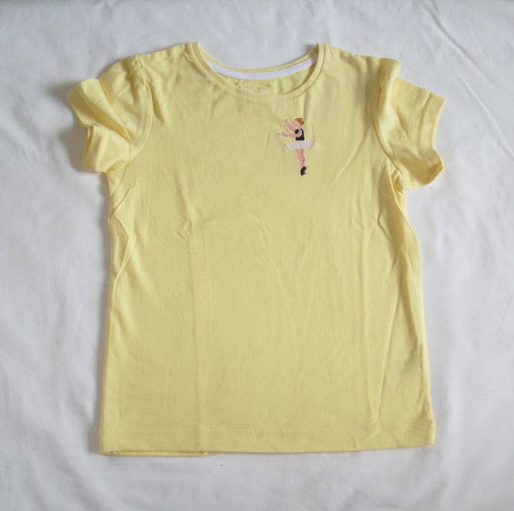 Do you have a little ballet dancer in your life? I have hand embroidered a ballerina in a white tutu on this pretty lemon yellow T-shirt. As I never use a permanent backing material when hand embroidering kids' clothing, there is nothing inside the shirt to irritate your child's skin. It is 100% cotton and is machine washable.