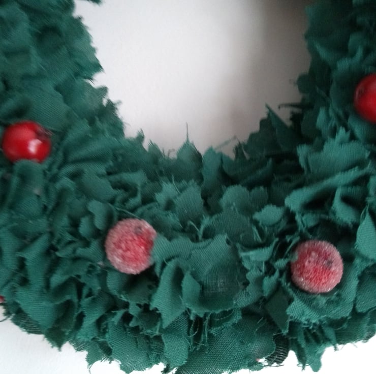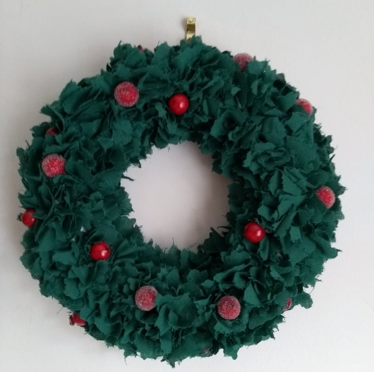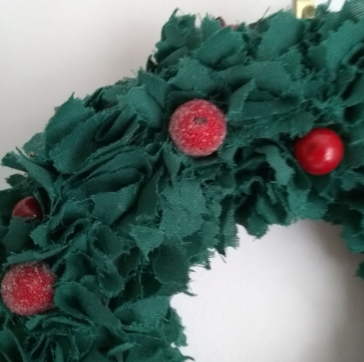 A completely handmade and uniquely designed wall hanging. Consisting of a polystyrene base which has had s all squared of cotton fabric pressed into it. Enhanced with berries, done frosted. The back had been covered in green felt. Has a brass ring for hanging which has been hand stitched