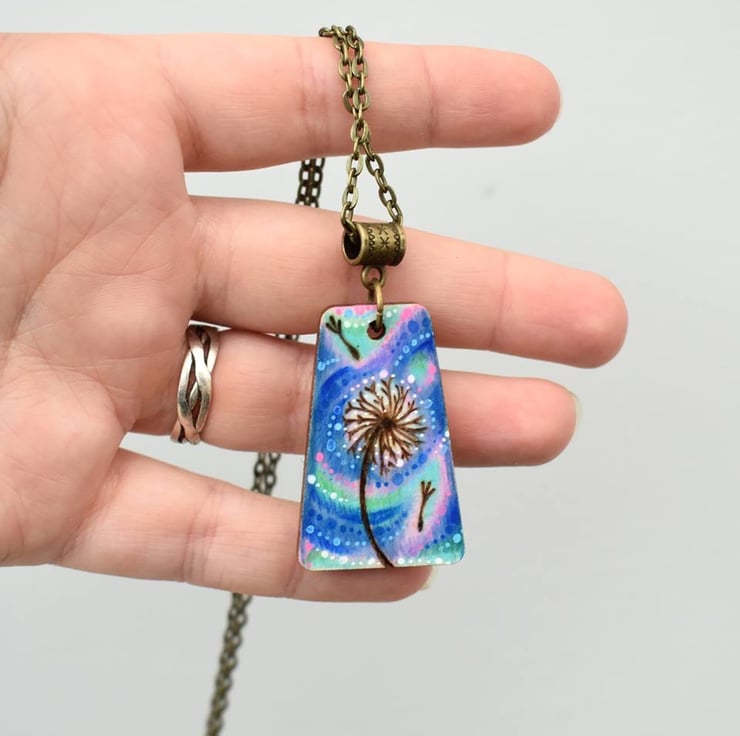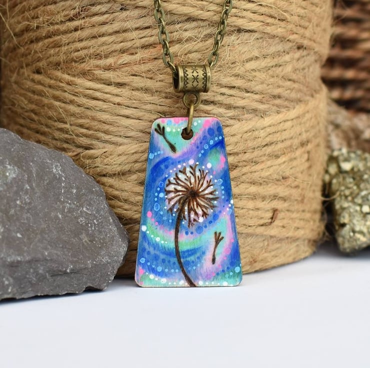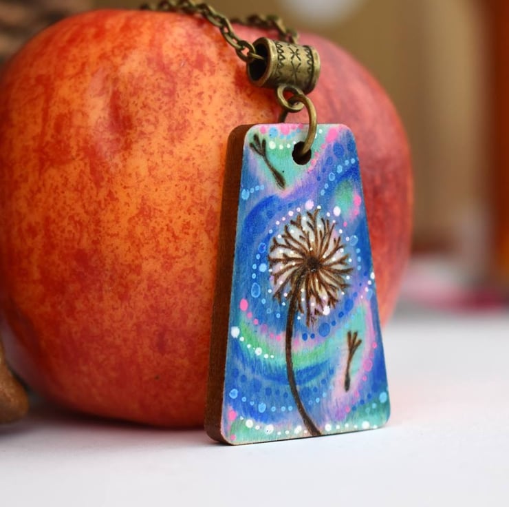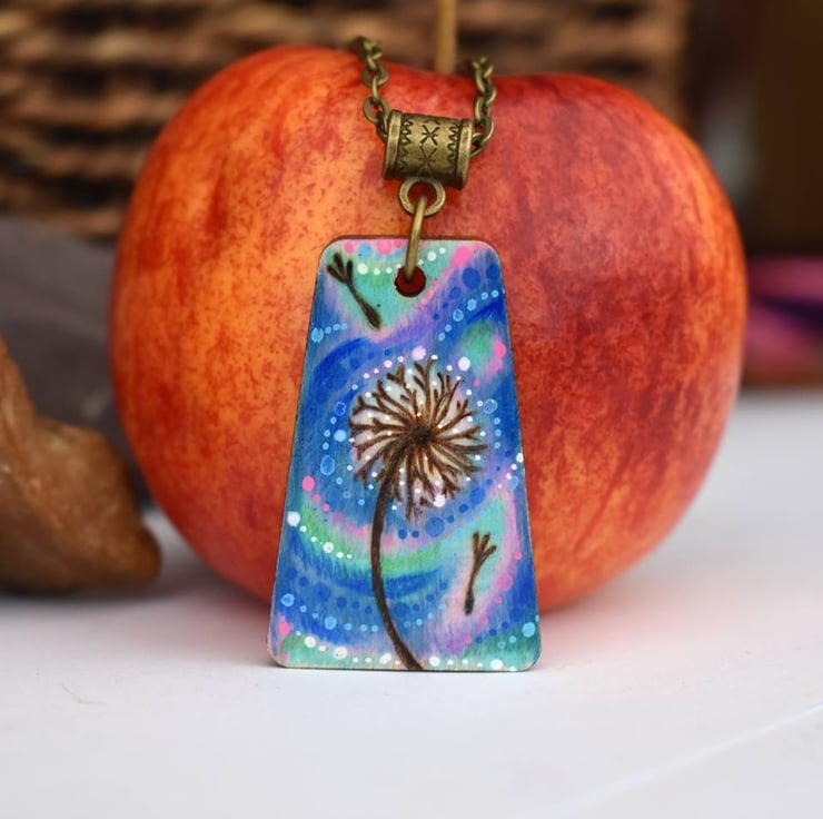 A small nebula themed dandelion clock pendant pastel purples and blues. All hand burned using pyrography and coloured with prismacolor pencil. This would make a great birthday or Christmas present, or 5th (wood) anniversary gift for those that see a wish rather than a weed.
