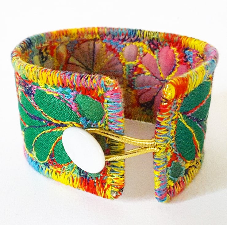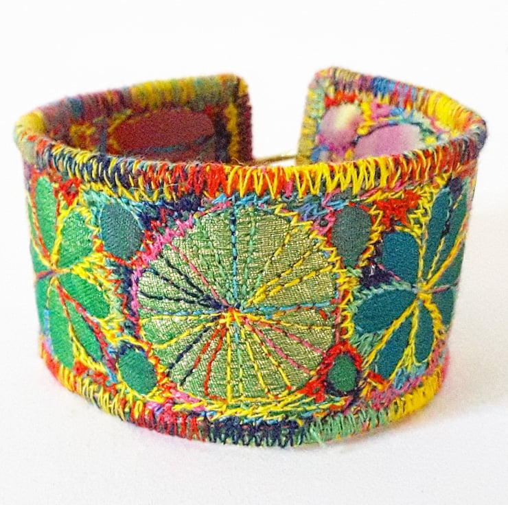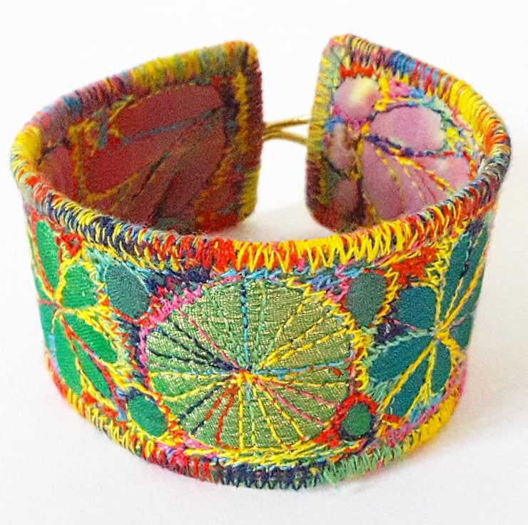 This is a handmade machine stitched fabric Stiched Silk Cuff or bracelet.