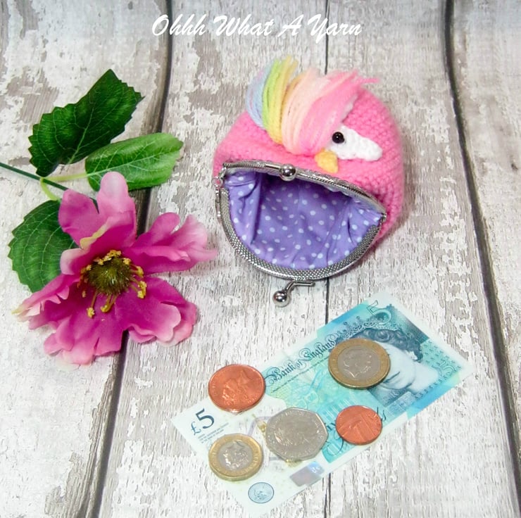 The body of the purse is a pretty pastel pink colour. It has a coordinating lilac polka dot cotton lining and a 8.5 cm kiss clasp. The front is decorated with a unicorn crocheted applique with a pastel rainbow mane.