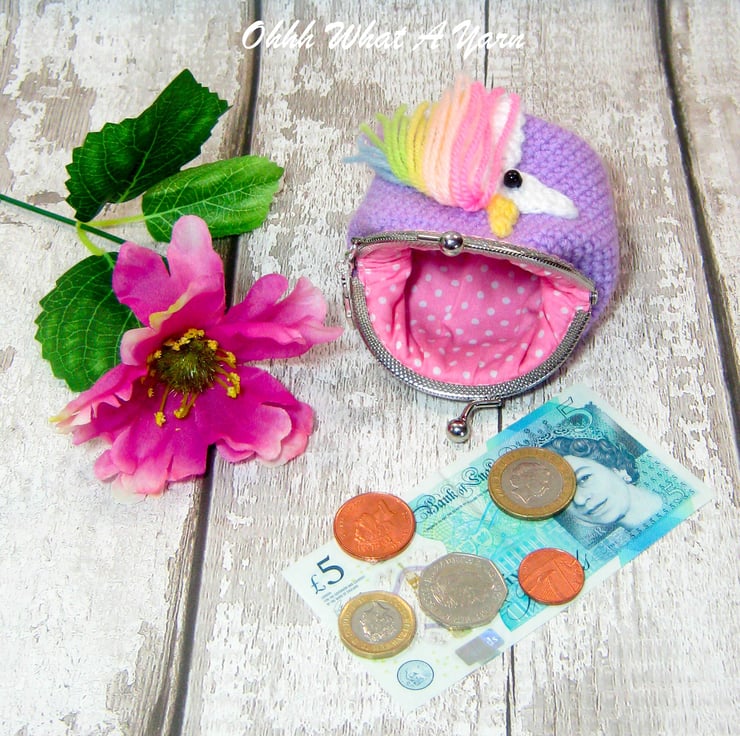 The body of the purse is a pretty pastel lilac colour. It has a coordinating pink and white polka dot cotton lining and a 8.5 cm kiss clasp. The front is decorated with a unicorn crocheted applique with a pastel rainbow mane.