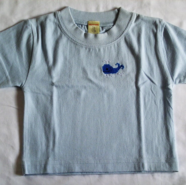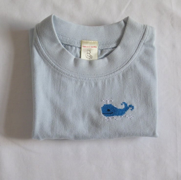 Do you have a new baby in the family? I have hand embroidered my smiley, spouting, blue whale on this baby blue T-shirt. As I never use a permanent backing material when hand embroidering kids' clothing, there is nothing inside to irritate your child's skin. The shirt is all cotton, and can be machine washed.
