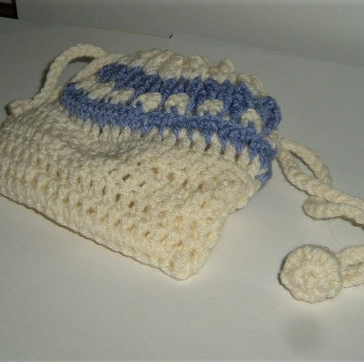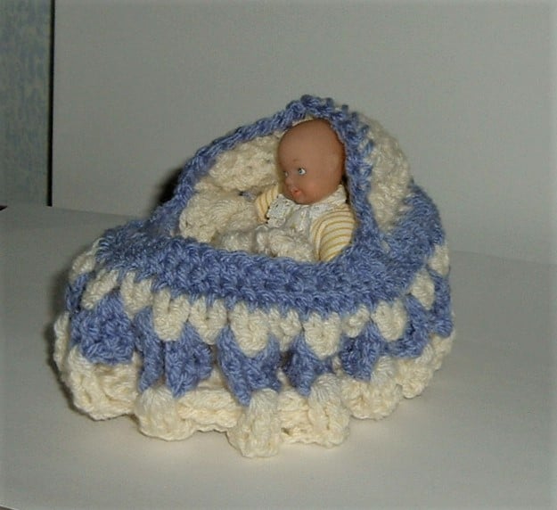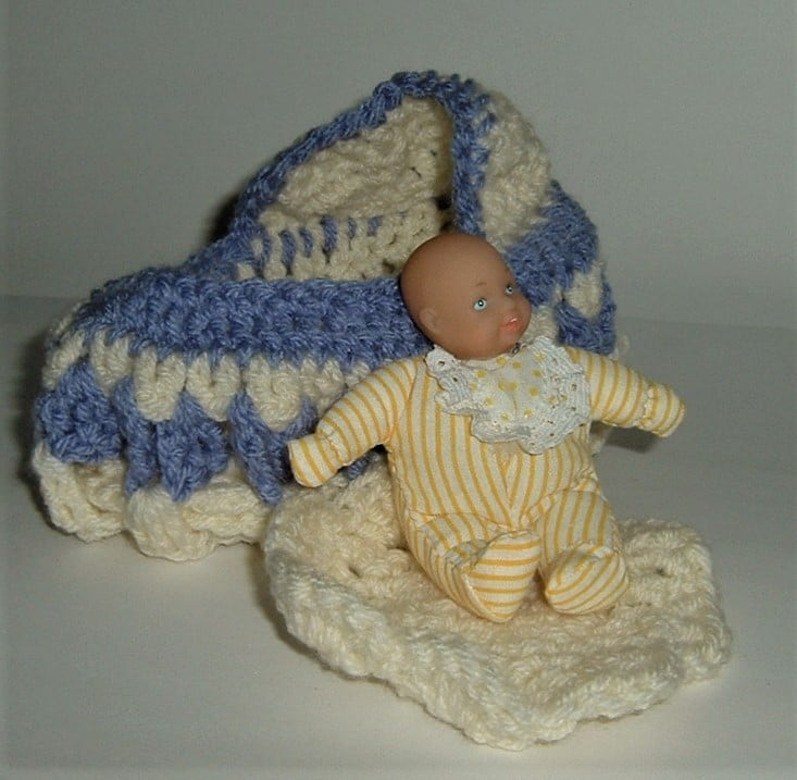 This cot has been crocheted to my own pattern and comes complete with a tiny doll and blanket