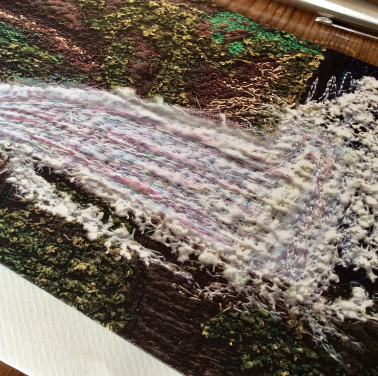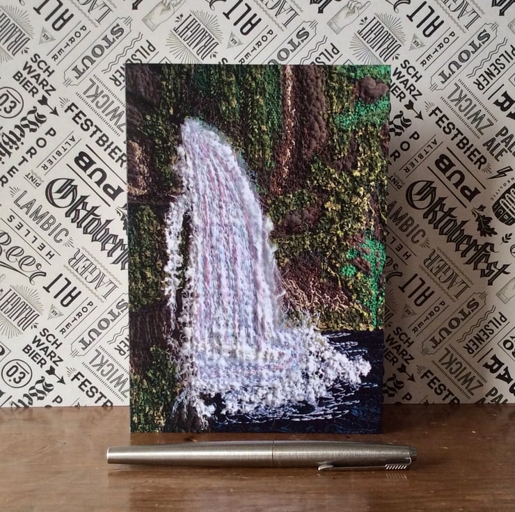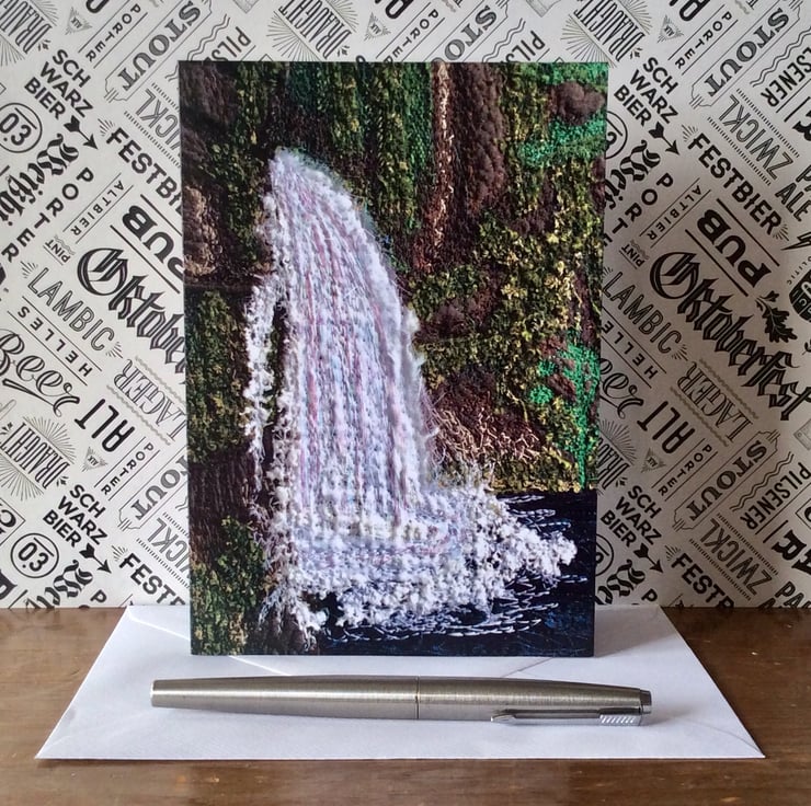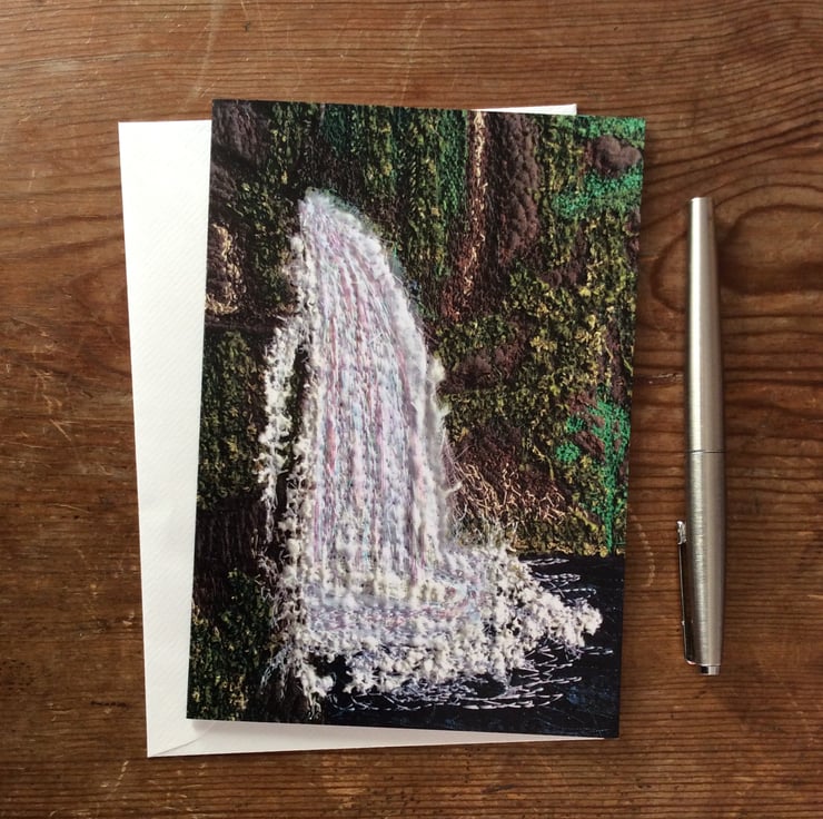 This card is a print of my free motion embroidery textile landscape. It shows Thornton Force waterfall, Ingleton, in the Yorkshire Dales. The print has really captured the texture, fabrics and stitching. Ideal for any occassion. The card measures 12.5 x 18cm and it comes with a white envelop in a plastic cover for protection.