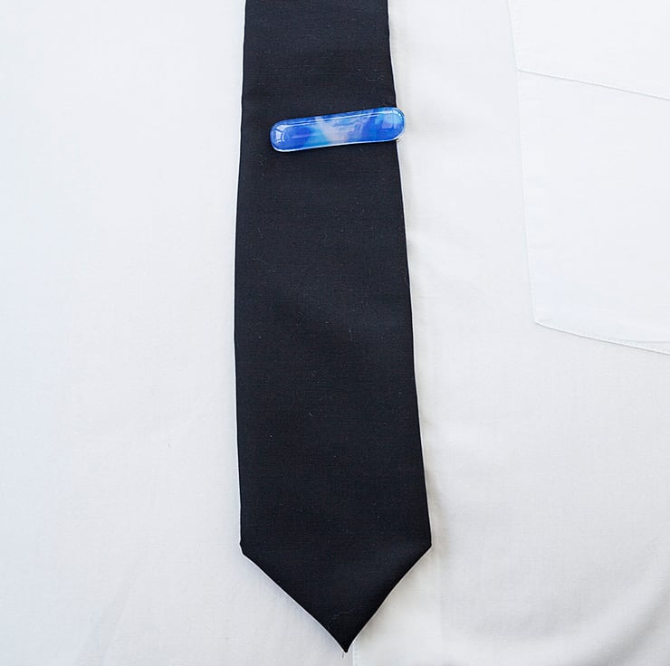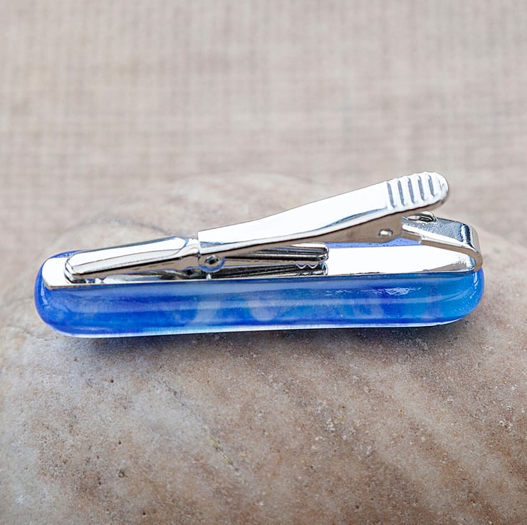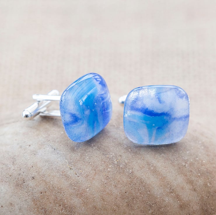 Treat yourself or your loved one with this gorgeous set of marbled blue cufflinks and tie bar. Each piece is made from a sheet of glass coloured by myself using powdered glass that is applied wet then swirled around giving the beautiful and unique patterns.
