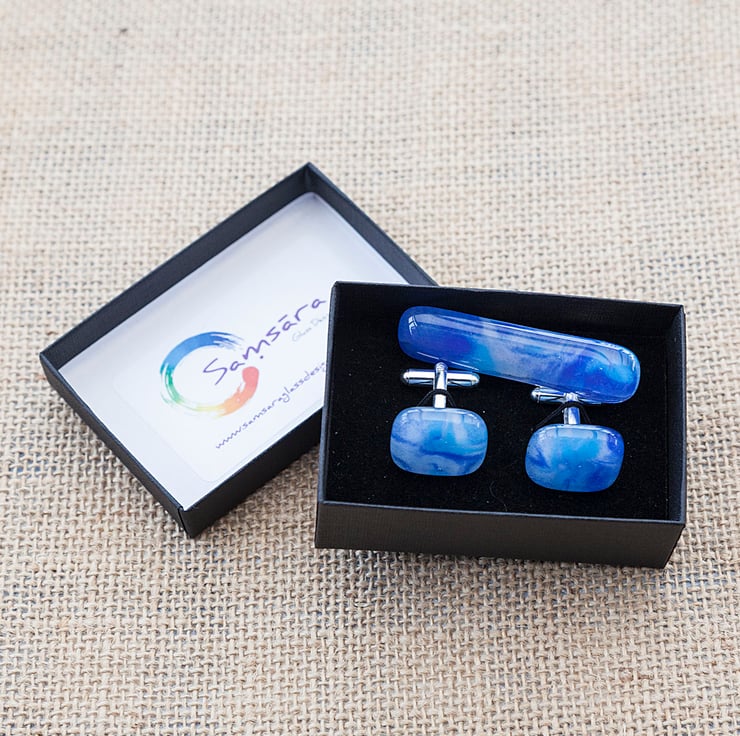 The glass of the cufflinks measure approximately 1.5cm by 1.5cm and are mounted on silver plated cufflink backs. The tie bar is approximately 5cm by 1.5cm. The set will be delivered in an attractive jewellery box as shown in the photographs.
