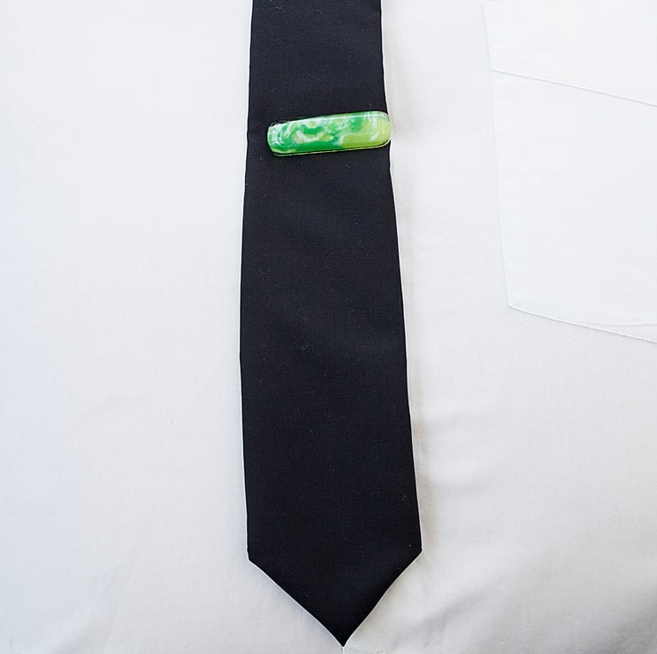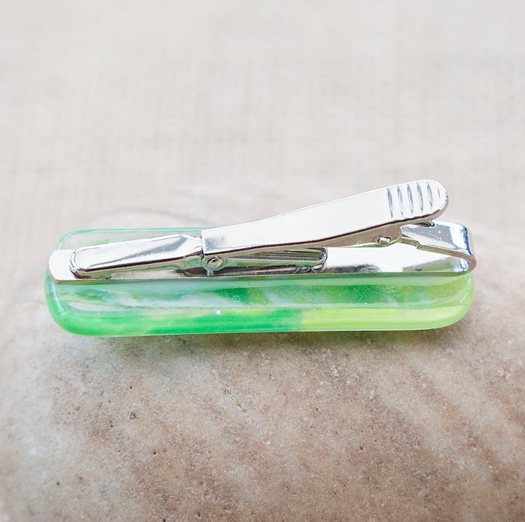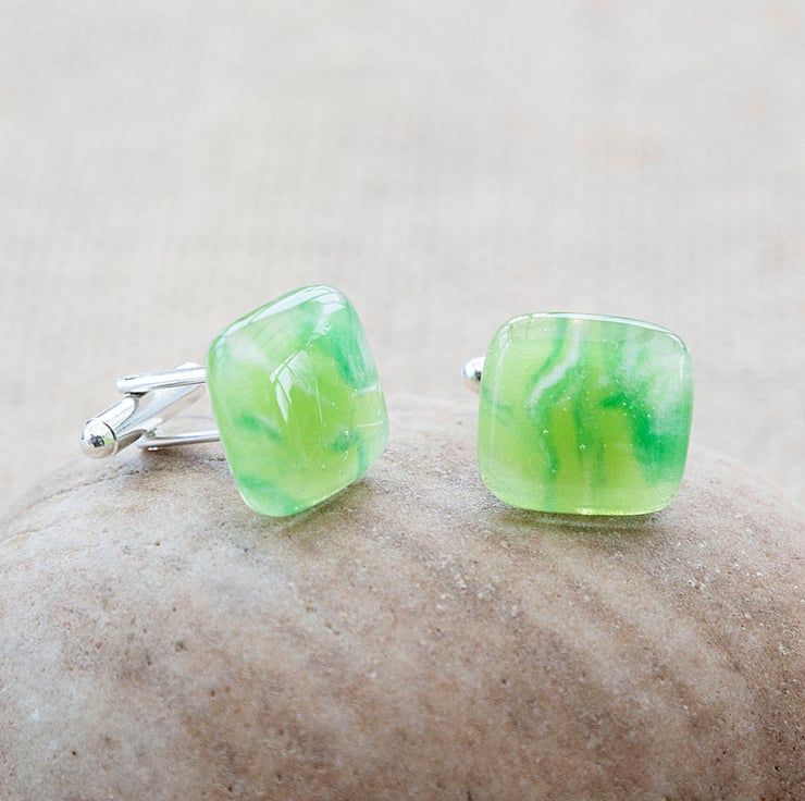 Treat yourself or your loved one with this gorgeous set of marbled green cufflinks and tie bar. Each piece is made from a sheet of glass coloured by myself using powdered glass that is applied wet then swirled around giving the beautiful and unique patterns.