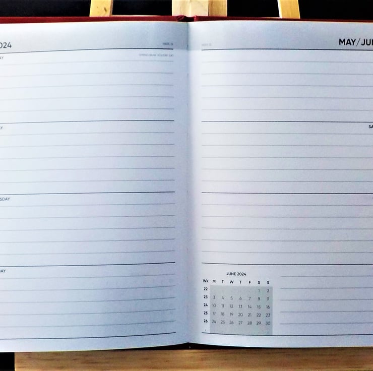 - an A6 standard year diary wtv Jan-Dec 2024.