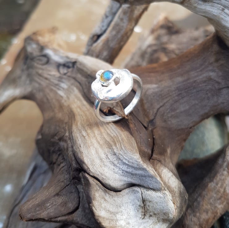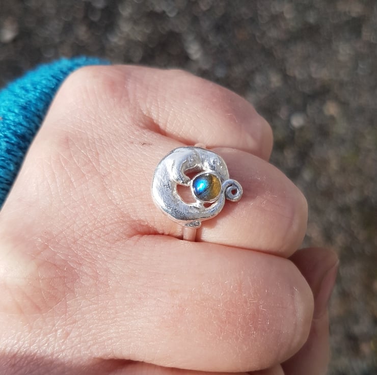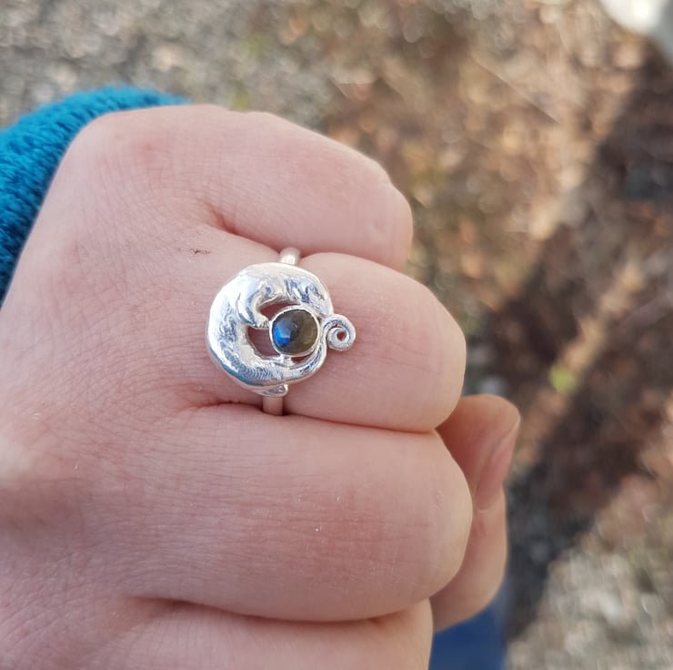 This pretty ring has an Otter curled around a blue flash labradorite gemstone.