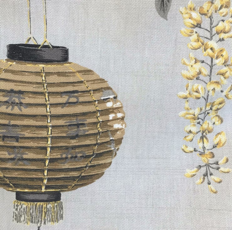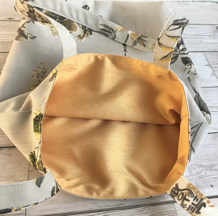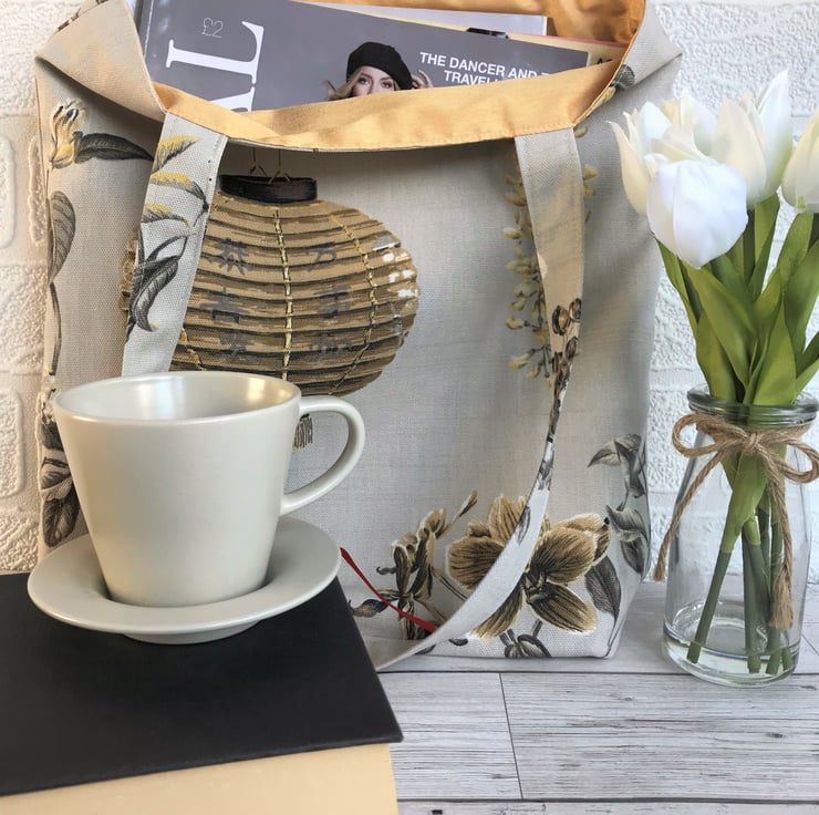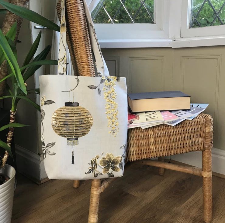 An Oriental themed tote bag in a lovely pale beige fabric with an attractive print pattern featuring a Chinese lantern hanging from a tree alongside a hanging cluster of golden yellow flowers. The lantern has a golden brown shade decorated with Chinese letters and a fringe and tassel at the bottom. The pattern also features beige and brown flowers and foliage. The bag is lined with a co-ordinating golden yellow fabric with a slight sheen.