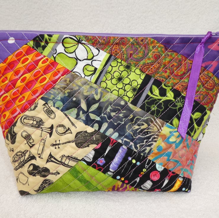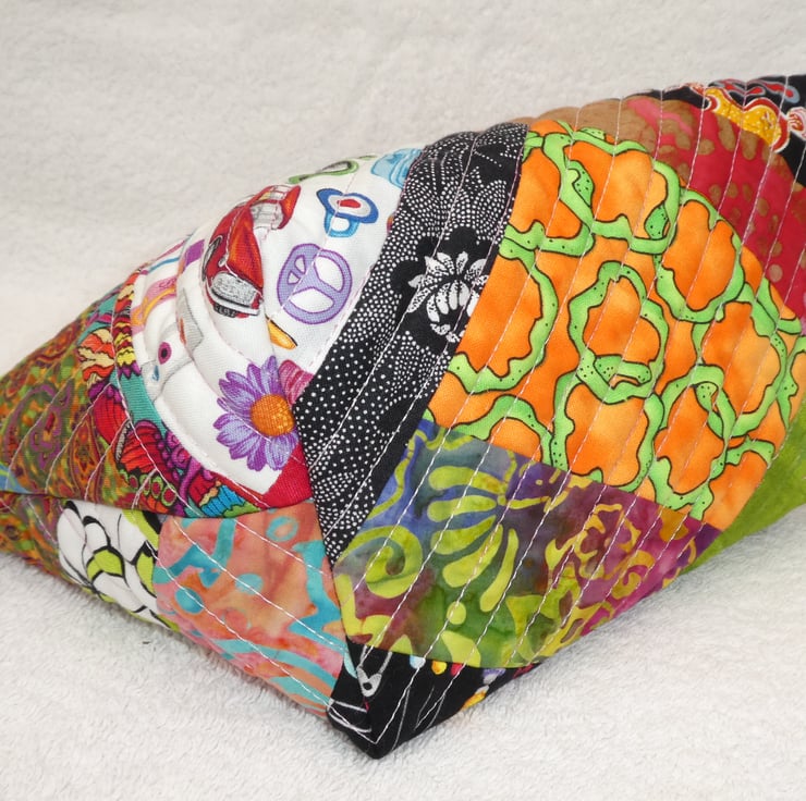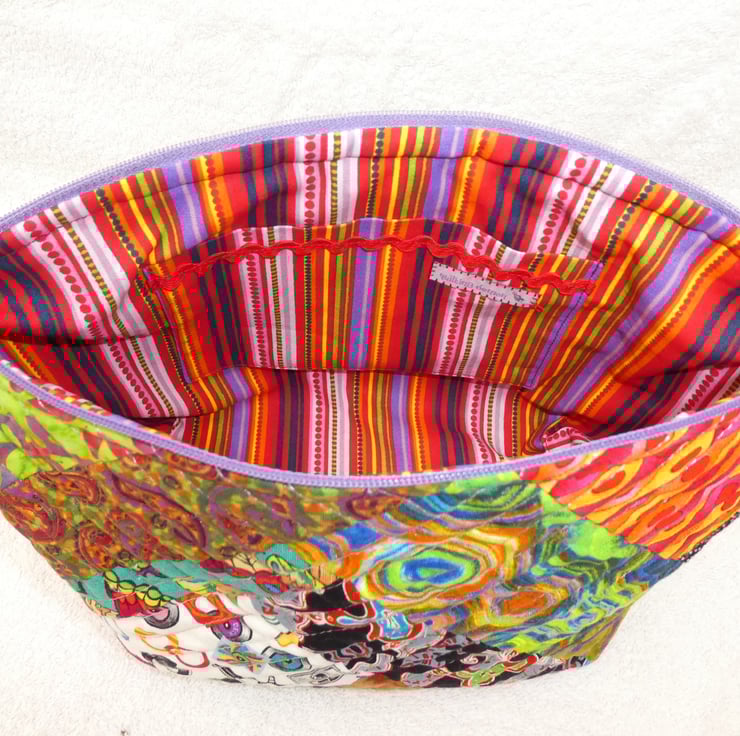This fabulous holdall has been created from crazy patchwork and is machine quilted over wadding using a variegated thread. It is fully lined and has an internal decorated pocket. The pouch has a squared off base to make it really nice and roomy, and free-standing.