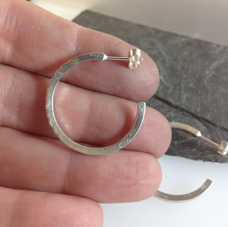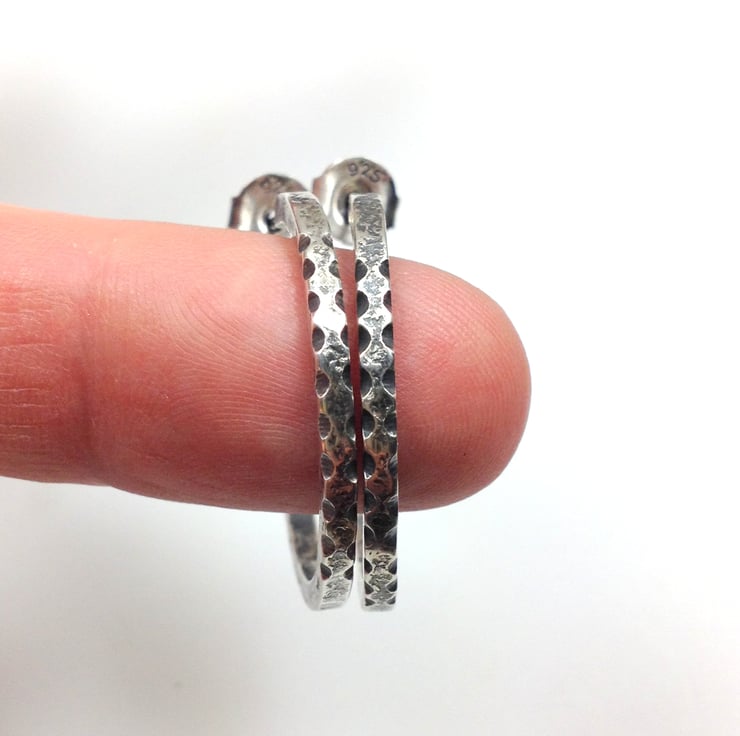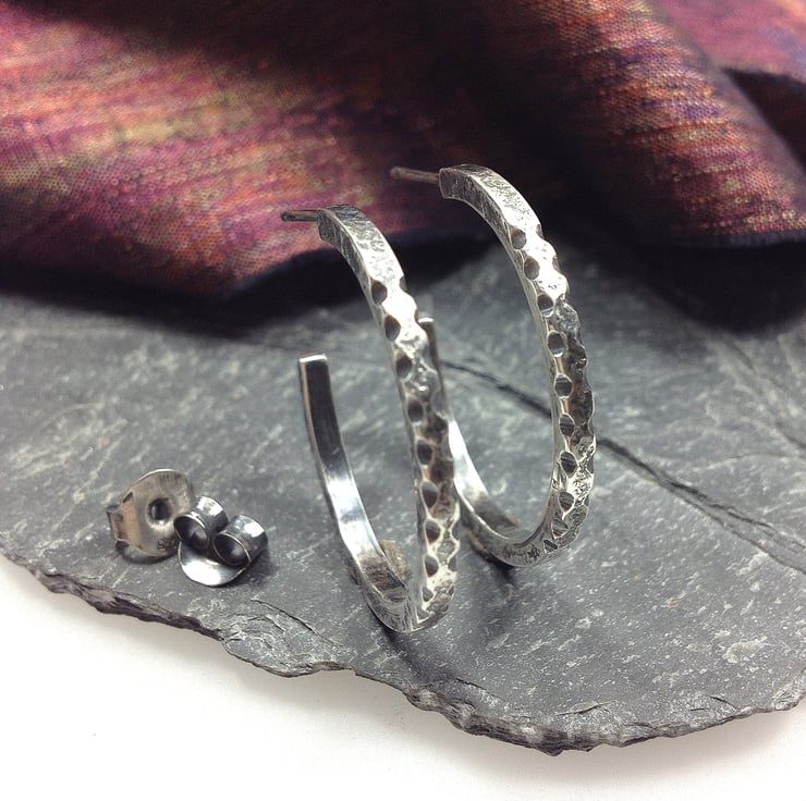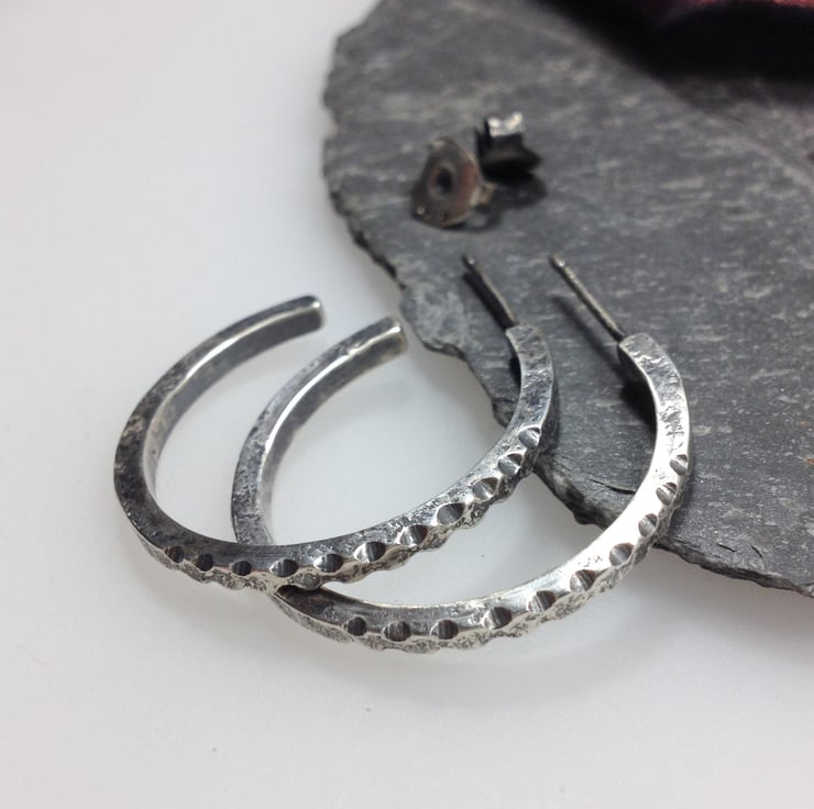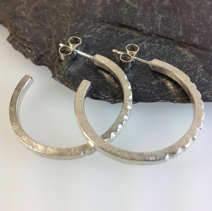 These large silver hoop studs are made from sterling silver square wire. They have a beaten weathered texture and a decorative carved pattern feature.