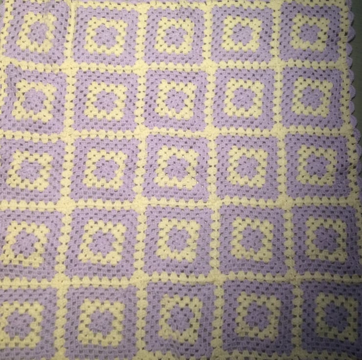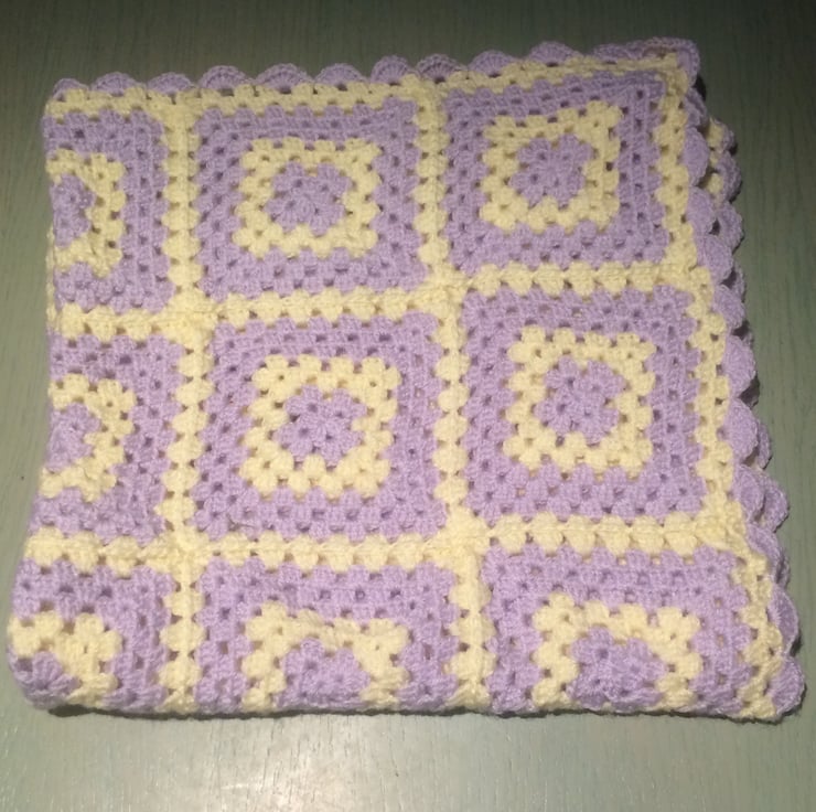 Crocheted in lovely soft dk yarn. This gorgeous blanket is made up of 25 granny squares. Lilac and yellow pattern. It is joined together with yellow yarn with a lilac shell edging pattern edging. Perfect for pram, Moses basket, car chair. 68cm x 68cm.