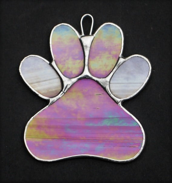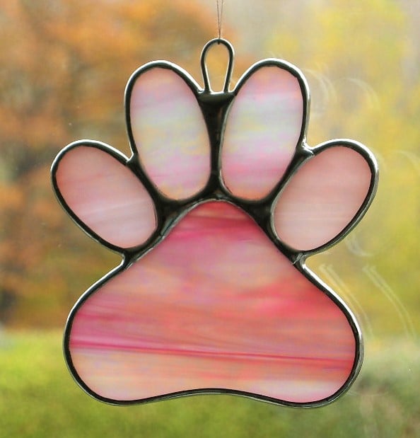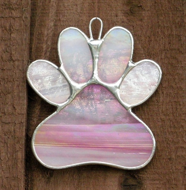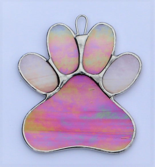 Paw Print stained glass suncatcher has been designed and handcrafted by myself using the copper foil method. The glass in this case (pink and white opalescent iridescent glass) has been cut to design where the edges of the glass is then wrapped in copper foil and soldered.